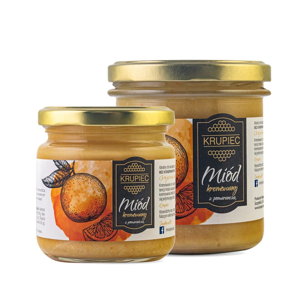 Miód Krupiec jest starannie wytwarzany zgodnie z tradycyjnymi metodami, z wyłącznie polskich pasiek i nie dodaje się do niego konserwantów, barwników, cukrów czy innych substancji słodzących, co czyni go odpowiednim produktem dla dzieci. Dodatek pomarańczy nadaje wyjątkowego smaku oraz wzbogaca miód o wartości odżywcze, zwłaszcza w Wit.C, czyniąc go doskonałym, zdrowym zamiennikiem dżemu i innych kremów. Miód Krupiec jest wspaniałym dodatkiem do herbaty i innych napojów, musli, jogurtu, naleśników lub słodką przekąską samą w sobie. Słoik zawiera 220 g miodu wielokwiatowego z dodatkiem liofilizowanych pomarańczy.