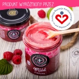 Miód z maliną nie zawiera konserwantów, sztucznych barwników, cukrów czy innych substancji słodzących, co czyni go odpowiednim produktem dla dzieci. Miód jest zdrowym zamiennikiem słodzików, idealnym dodatkiem do herbaty i innych napojów, naleśników, gofrów lub kanapek. Słoik zawiera 420 g miodu nektarowego wielokwiatowego o kremowej konsystencji z dodatkiem liofilizowanej maliny.
