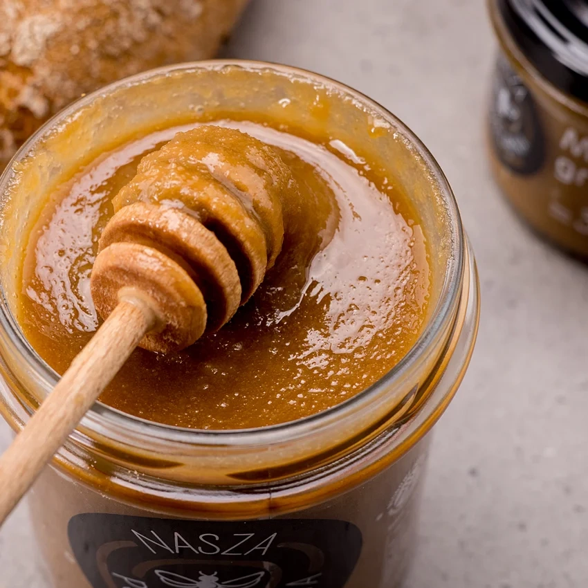 WAŻNE: Do produkcji miodu Nasza Pszczelarnia używa się wyłącznie naturalnego miodu pszczelego. Prawdziwy miód krystalizuje się już przy temperaturze otoczenia 16-18°C i jest to naturalny proces. Miód gęstnieje i zmienia swój stan skupienia z ciekłego na stały. Przechowywanie miodu w temperaturze 38-40°C pozwoli zachować jego płynną konsystencję, natomiast zaleca się zachowanie go w formie skrystalizowanej, aby zachować jego wszystkie prozdrowotne właściwości.