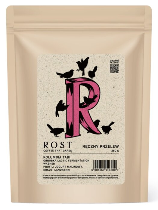 ROST Kolumbia Tabi to kawa o wysokiej słodyczy i wyraźnej kwasowości. W jej smaku możemy wyczuć nuty jogurtu malinowego, kokosa i landrynek.