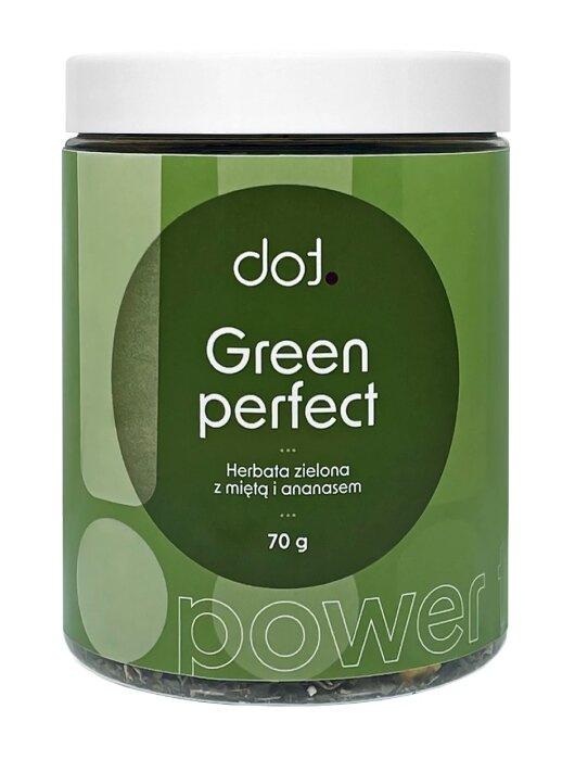 Herbata zielona Green Perfect Dot. to chińska herbata, która oprócz bazy w postaci zielonych liści zawiera aromatyczną i orzeźwiającą miętę, kawałki ananasa, pomarańczę, płatki bławatka oraz dla podkręcenia imbir i goździki. Wspaniała opcja dla szukających ciekawych smaków.