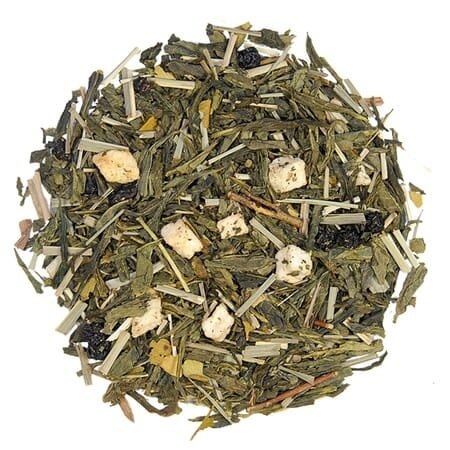 Skład: zielona herbata Sencha (63%), trawa cytrynowa (12%), kawałki jabłek, jagody (6%), aromat, mirt cytrynowy.