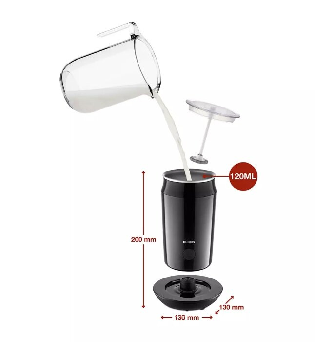 - Pianka mleczna na 2 cappuccino jedncześnie: Z pojemnością 120 ml, spieniacz dostarcza wystarczająco dużo pianki, by przygotować dwa perfekcyjne cappuccino. Jego obsługa jest dziecinnie prosta – wszystko za sprawą intuicyjnego przycisku sterującego.