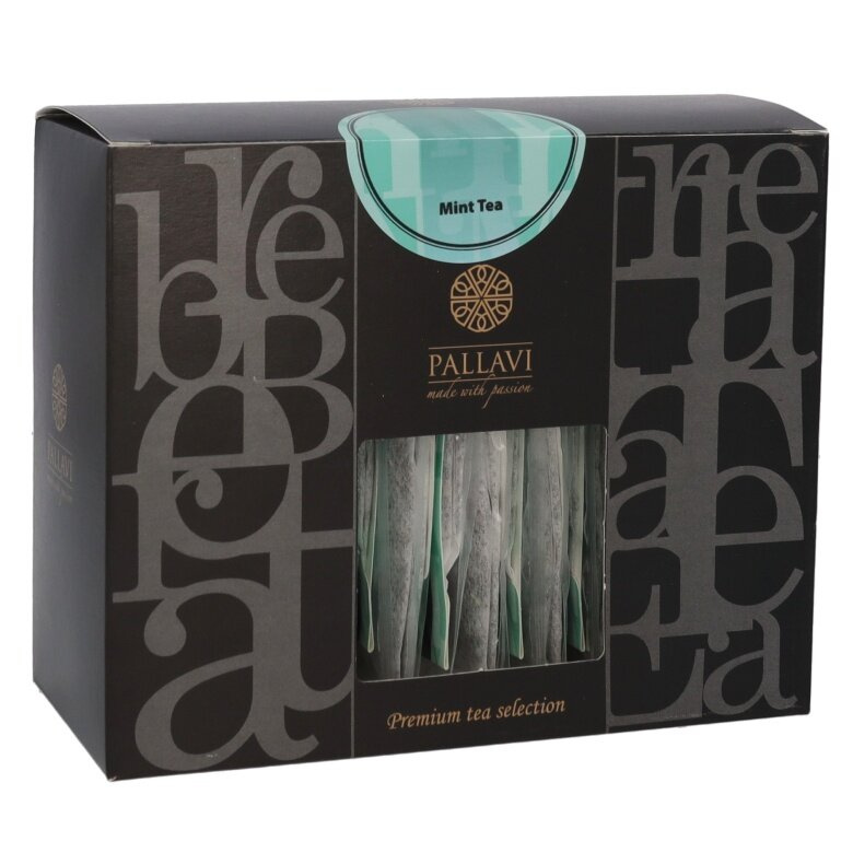 Opakowanie zawiera 25 torebek z herbatą miętową Pallavi Mint.