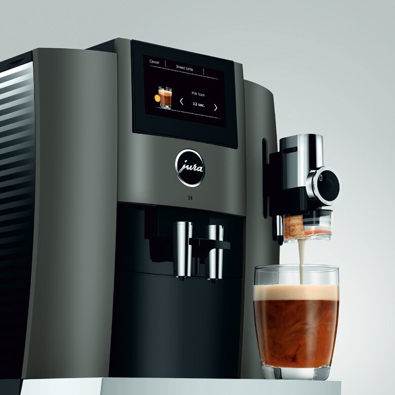 Funkcja Sweet Foam nadaje smak piance mlecznej bezpośrednio podczas przygotowywania, podgrzewając mleko, spieniając je i równomiernie doprawiając syropem ze specjalnej końcówki spieniacza. Rezultatem jest subtelnie słodzona mleczna pianka, która zapewnia zupełnie nowe doznania przyjemności. JURA S8 Dark Inox (EB) za naciśnięciem jednego przycisku przygotuje modne specjały kawowe, takie jak Sweet Latte czy Sweet Cappuccino. Zawsze w idealnej temperaturze dzięki funkcji gorącego mleka.
