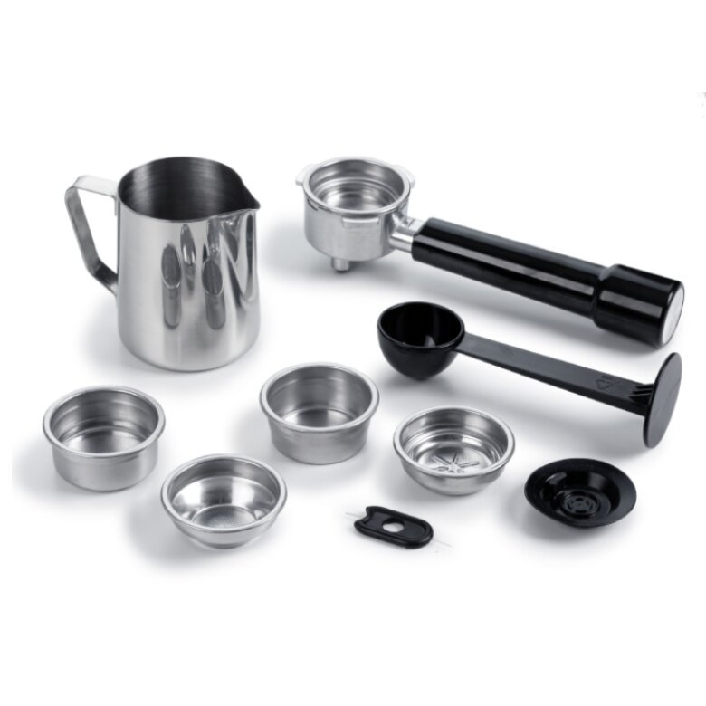 Akcesoria w zestawie: | Filtr wody, metalowa kolba, 5 wymiennych sitek do dużego i małego espresso oraz podsów E.S.E, łyżka z miarką i tamperem, metalowy dzbanek do spienienia mleka |