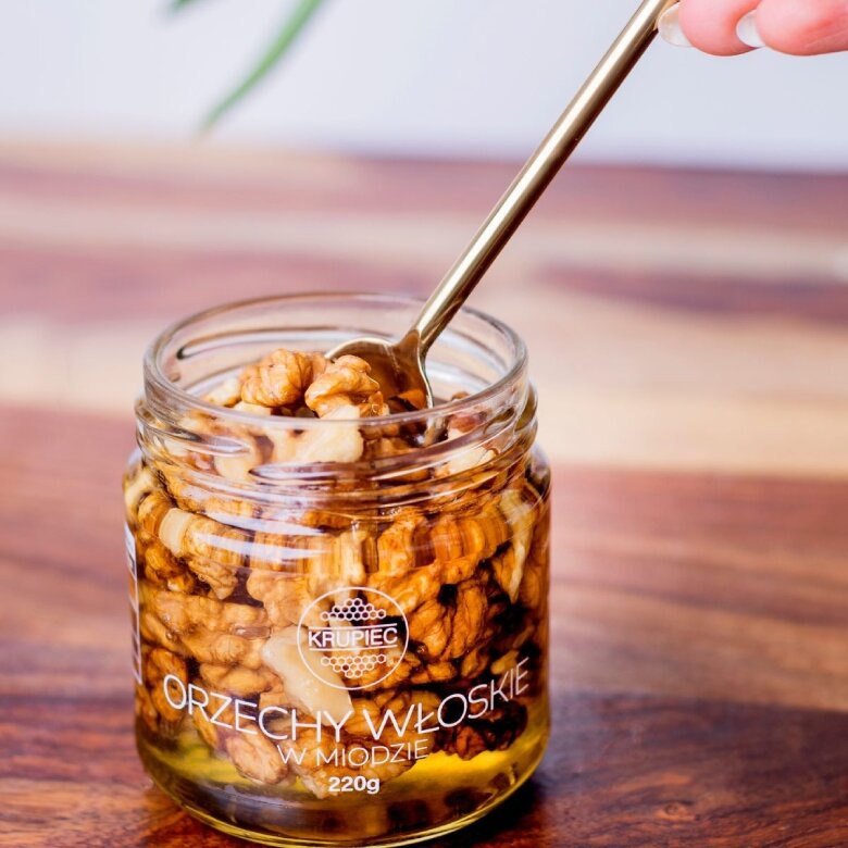 Orzechy włoskie w miodzie Krupiec to połączenie chrupiących, prażonych orzechów włoskich z miodem akacjowym, które tworzą nie tylko smaczny, ale i odżywczy produkt. Orzechy zawarte w miodzie Krupiec wspierają funkcjonowanie mózgu dzięki obecności kwasów tłuszczowych omega-3 i wspomagają pracę układu sercowo-naczyniowego. Dzięki swoim właściwościom antyoksydacyjnym orzechy włoskie w miodzie akacjowym skutecznie walczą ze stresem oksydacyjnym, chroniąc komórki przed przedwczesnym starzeniem i tworząc nie tylko smakowitą, ale i zdrową przekąskę.