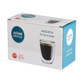Zestaw dwóch szklanek termicznych Altom Andrea, o pojemności 300 ml i klasycznym kształcie, w których napój prezentuje się wyjątkowo. Szklanki są wykonane z podwójnego szkła, przez co dłużej trzymają ciepłą temperaturę napoju i chronią dłonie przed oparzeniem. Są przeznaczone do codziennego użytku oraz na specjalne okazje. Doskonałe do kawy, wody, drinków i innych napojów. W zestawie znajdują się dwie sztuki.