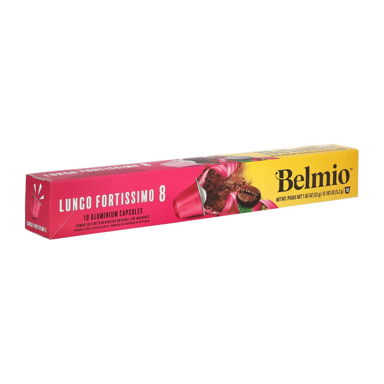Belmio Lungo Fortissimo to ciemno palona kawa zamknięta w aluminiowe kapsułki przeznaczone do systemu Nespresso®. Opakowanie zawiera 10 kapsułek z kawą Belmio Lungo Fortissimo. Przygotujesz z nich czarną kawę o pojemności 110 ml. Intensywność smaku: 8/10.