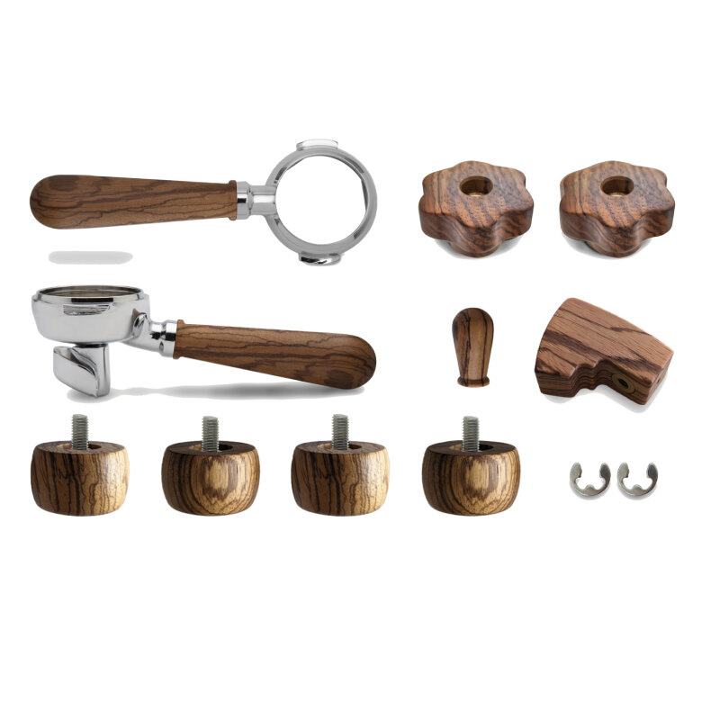 Zestaw drewnianych elementów przeznaczony do ekspresu Lelit Bianca PL162T. Elementy wykonane są z drewna Zebrano, co zapewnia wyrafinowany efekt estetyczny i daje przyjemność w dotyku. Zestaw składa się z dwóch pokręteł do dyszy pary i gorącej wody, pokrętła do dźwigni, łopatki i czterech nóżek. Wyposażony jest również w dwie kolby z uchwytami z drewna Zebrano w dwóch wersjach: naked i z 2-drożną wylewką do kawy Lelit58. Do zestawu dołączona jest instrukcja montażu.