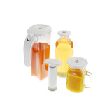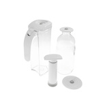 W skład zestawu wchodzi: Dzbanek 1 L, węższa pokrywa do butelki (2,5-5 cm), szersza pokrywa do słoików (4-7,5 cm), pompka próżniowa.