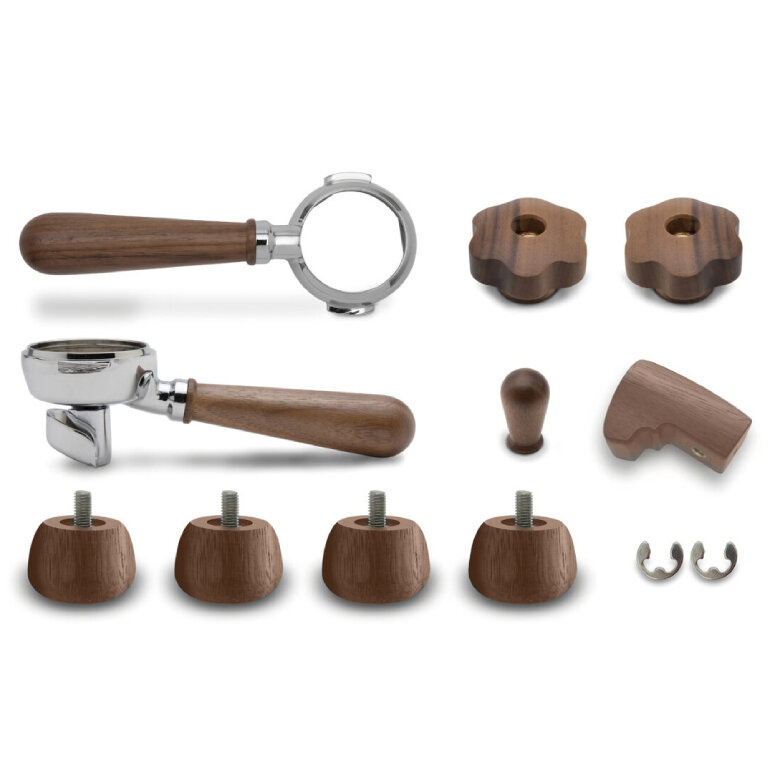 Zestaw drewnianych elementów przeznaczony do ekspresu Lelit Bianca PL162T. Elementy wykonane są z brązowego drewna orzechowego, co zapewnia elegancki efekt estetyczny i daje przyjemność w dotyku. Zestaw składa się z dwóch pokręteł do dyszy pary i gorącej wody, pokrętła do dźwigni, łopatki i czterech nóżek. Wyposażony jest również w dwie kolby z uchwytami z białego drewna orzechowego w dwóch wersjach: naked i z 2-drożną wylewką do kawy Lelit58. Do zestawu dołączona jest instrukcja montażu.