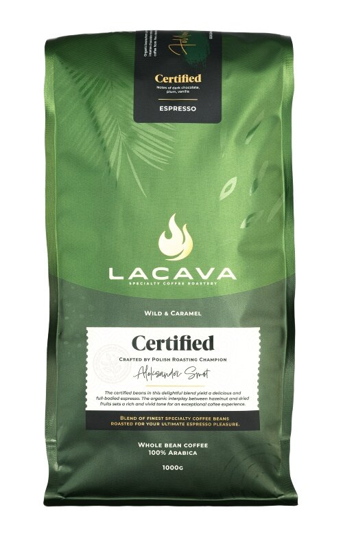 LaCava Certified to sezonowy blend starannie dobranych ziaren arabiki Specialty BIO, pochodzących z upraw organicznych i przeznaczony do ekspresów ciśnieniowych i kawiarek.