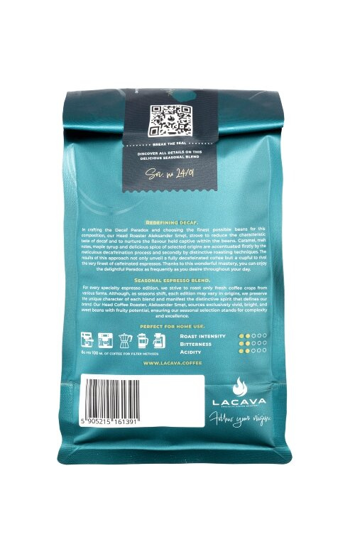 LaCava Decaf Paradox to kawa bezkofeinowa - sezonowy blend starannie dobranych ziaren arabiki Specialty , poddany procesowi dekofeinizacji i przeznaczony do ekspresów ciśnieniowych i kawiarek.