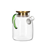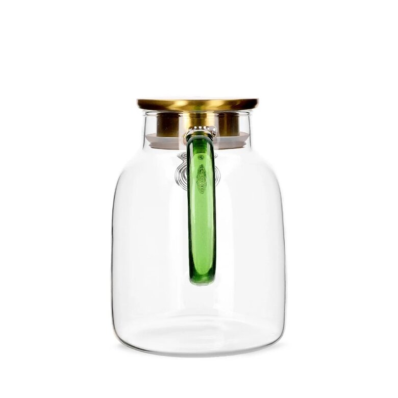 Szklany dzbanek Homla Kubbe o prostych kształtach to elegancki dzbanek na herbatę w stylu glamour o pojemności 1800 ml. Przejrzyste ścianki dzbanka pięknie eksponują złocistą barwę herbaty i umieszczone w niej dodatki, dodając estetycznego uroku każdemu stołowi. Dzbanek KUBBE ma wygodny, szeroki uchwyt w zielonym odcieniu oraz eleganckie wieczko w odcieniu królewskiego złota, które dodaje naczyniu szyku.