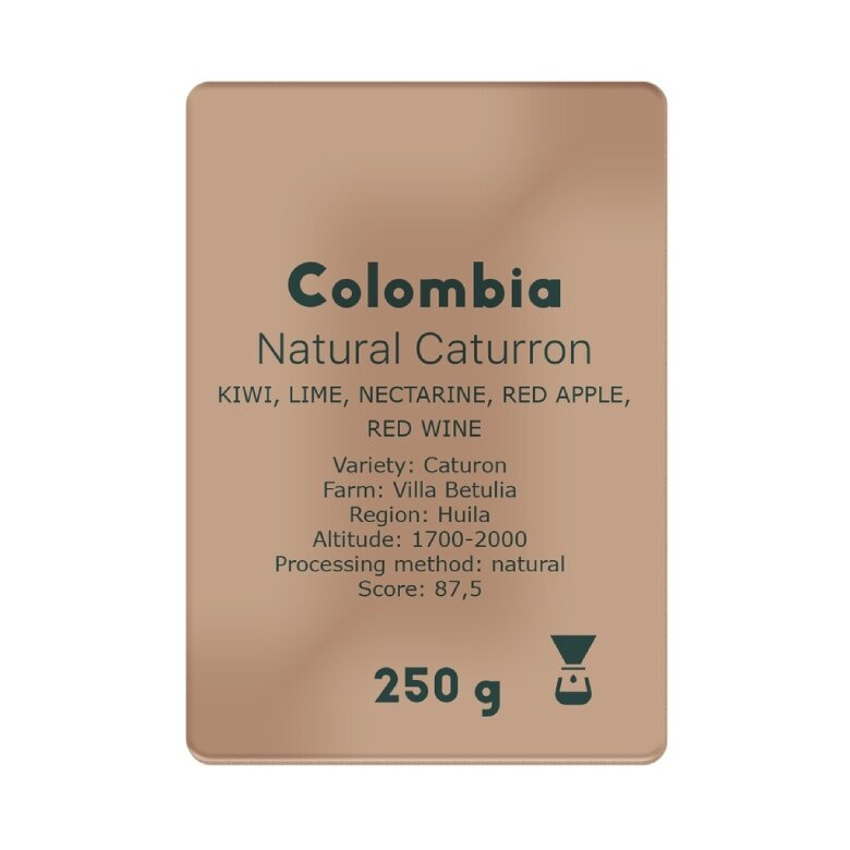 Wyjątkowo orzeźwiająca kawa o przyjemnej kwasowości i dużej owocowości, dzięki naturalnej obróbce. W profilu sensorycznym Colombia Natural Caturron odnajdziemy nuty kiwi, nektarynki, limonki, czerwonego jabłka i czerwonego wina.