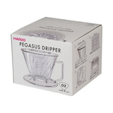 W Dripie Hario Pegasus 02 można zaparzyć jednorazowo 300 - 500 ml kawy (od 2 do 4 filiżanek). Drip Pegasus został wykonany z wysokiej jakości tworzywa sztucznego, w którym od wewnątrz zrobione są wyżłobienia polepszające przepływ wody. Zaparzacz na dnie ma dwa otwory, które zapewniają równomierne parzenie. Praktyczne okienko w podstawie umożliwia łatwe monitorowanie procesu parzenia. Mocną stroną drippera Hario jest niezwykle prosta obsługa oraz możliwość zaparzenia doskonałej kawy, a to wszystko w stosunkowo niskiej cenie.
