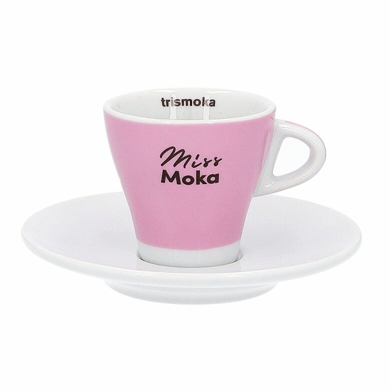 Porcelanowa filiżanka Trismoka Miss Moka o pojemności 60 ml. Filiżanka doskonale sprawdzi się do przygotowania aromatycznego espresso we włoskim stylu. Różowa filiżanka z logo Miss Moka i biała podstawka są wykonane z grubej porcelany.