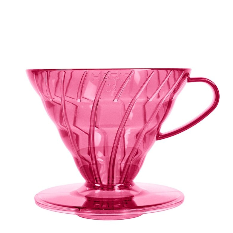 Plastikowy Drip V60-02 to zaparzacz do kawy japońskiej firmy Hario wykonany z wysokiej jakości tworzywa sztucznego w intensywnym, różowym kolorze.