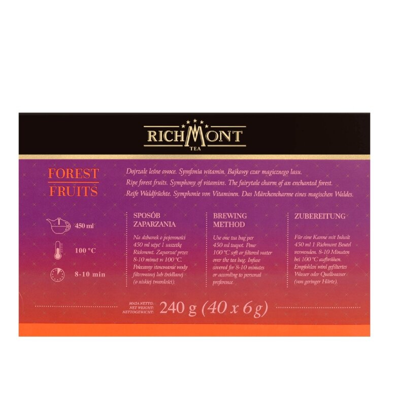 Przygotowując herbatę Richmont Forest Fruits należy zwrócić uwagę zarówno na odpowiednią ilość i temperaturę wody jak i czas parzenia. Sugerujemy przygotować Richmont Forest Fruits następująco: