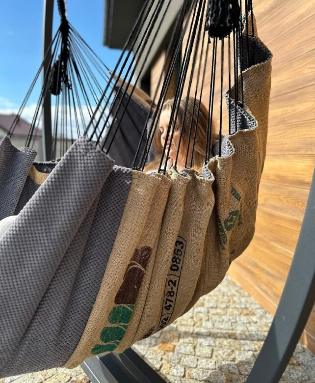 Zewnętrzna strona siedziska hamaka wykonana jest z oryginalnych worków jutowych po kawie z recyklingu pochodzących z palarni kawy. Materiał ten nadaje mu niepowtarzalny charakter i sprawia, że produkt jest przyjazny dla środowiska. Worki są wykonane w 100% z naturalnego sznurka — juty. Wewnątrz fotela znajduje się tkanina obiciowa wysokiej jakości (Water Stop) w kolorze szarym, która zapewnia trwałość i łatwość w utrzymaniu czystości oraz jest niezwykle przyjemna w dotyku. Wewnątrz znajduje się również praktyczna kieszonka, do której można włożyć książkę, czy telefon.