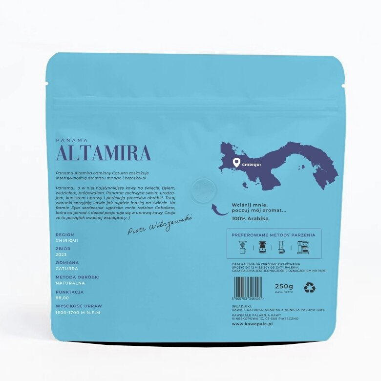 KawePale Panama Altamira to jasno palona arabika Specialty z Panamy, prosto z plantacji, którą KawePale odwiedziło. Jest to kawa przeznaczona do przelewowych metod parzenia. Ziarna tej kawy to odmiana Caturra, która pochodzi z regionu Chiriqui, gdzie rośnie na wysokości 1600-1700 m n.p.m. Panama Altamira została poddana obróbce naturalnej, a w teście jakości otrzymała 86 punktów.