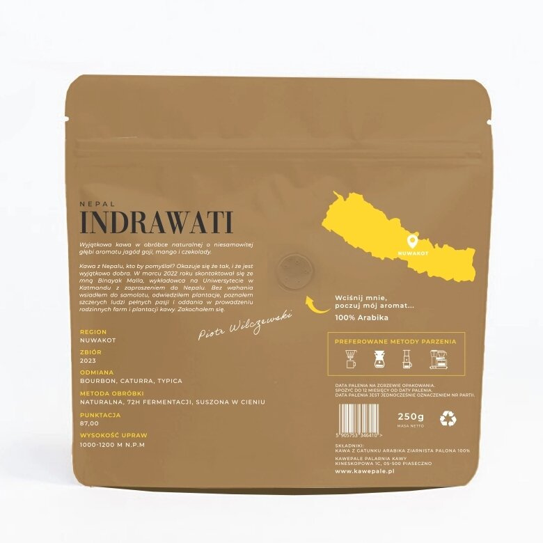 KawePale Nepal Indrawati to jasno palona kawa Specialty z Nepalu, prosto z plantacji, którą KawePale odwiedziło. Jest to kawa przeznaczona do przelewowych metod parzenia. Ziarna odmiany Bourbon, Caturra i Typica pochodzą z regionu Sindhupalchowk, gdzie rosną na wysokości 1000-1200 m n.p.m. Nepal Indrawati została poddana obróbce naturalnej i 72-godzinnej fermentacji z dodatkiem jogurtu koziego, która podkreśliła wyjątkowy smak kawy. W teście jakości otrzymała 87 punktów.