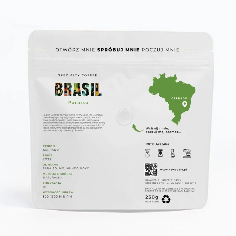 KawePale Brasil Paraiso to jasno palona brazylijska arabika Specialty, którą tworzą ziarna odmian Paraiso, MG i Mundo Novo rosnące na wysokości 800-1300 m n.p.m. w regionie Cerrado. Brasil Paraiso została poddana obróbce naturalnej i jest przeznaczona do przelewowych metod parzenia. W teście jakości SCA otrzymała 83 punkty.