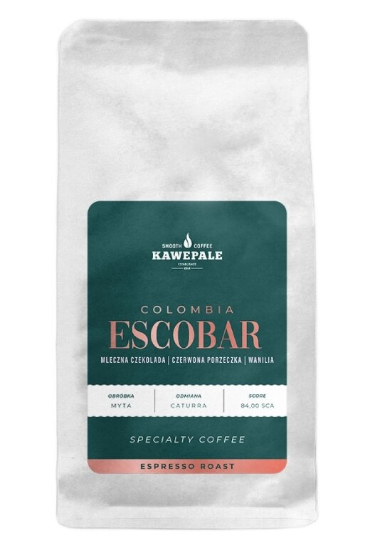 KawePale Colombia Escobar to średnio palona kawa najwyższej jakości Specialty przeznaczona do ekspresów ciśnieniowych oraz kawiarek. Jej ziarna odmiany Caturra pochodzą z Kolumbii, gdzie rosną na wysokości 1800 m n.p.m w regionie Ciudad Bolivar. Colombia Escobar została poddana obróbce metodą mytą, a w teście jakości uzyskała 84 punktów.