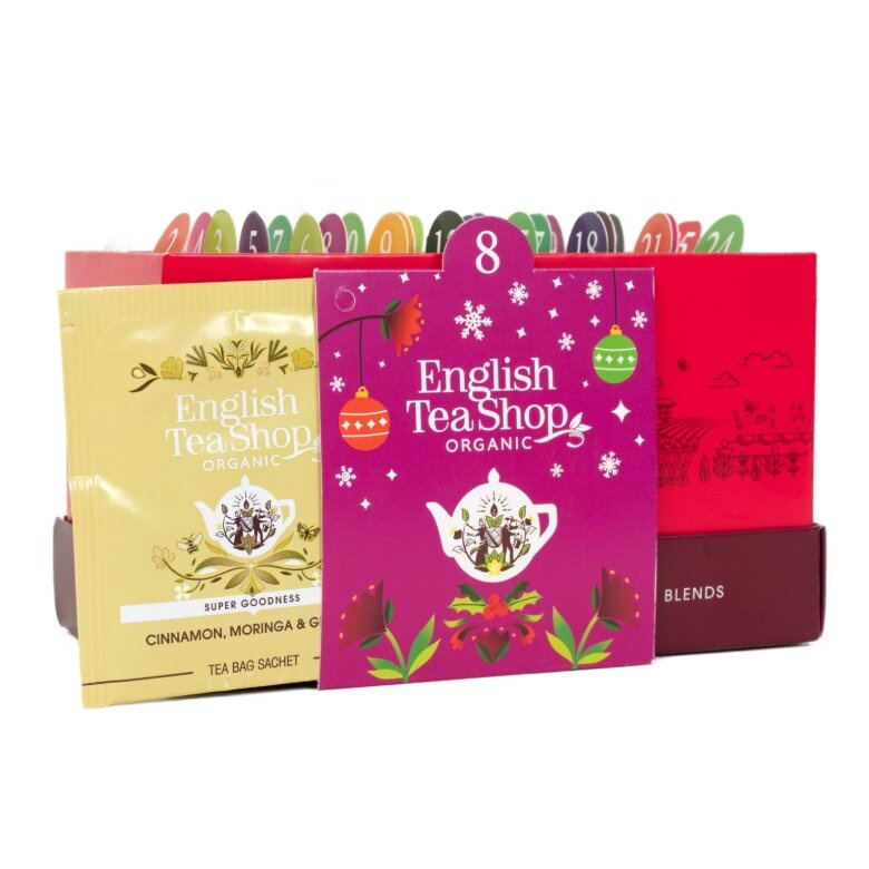 Kalendarz adwentowy English Tea Shop RED to świąteczny zestaw ulubionych mieszanek ekologicznych herbatek zamkniętych w piramidki. Opakowanie zawiera 25 piramidek z herbatą w 13 smakach. Każda z nich jest mieszanką organicznej herbaty czarnej, białej, ziołowej i rooibosa z ziołami, przyprawami i owocami. Kolekcja herbat English Tea Shop rozbudzi w nas świąteczną atmosferę i świetnie sprawdzi się jako prezent dla bliskiej osoby.