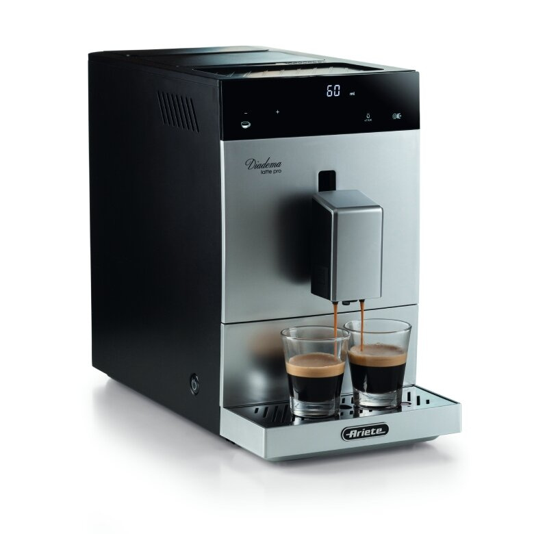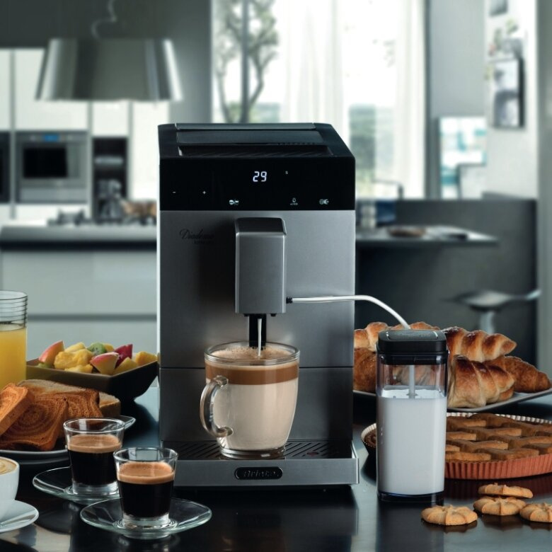 Srebrny Ariete Diadema z wbudowanym młynkiem oferuje 6 programowalnych specjałów, w tym espresso, americano, czy latte macchiato, gorące mleko i wodę do herbaty, co czyni go niezwykle wszechstronnym. Zintegrowany stalowy młynek z żarnami oraz regulacją grubości mielenia kawy pozwala dostosować napar do indywidualnych preferencji. Urządzenie posiada automatyczny system spieniania mleka, co sprawia, że przygotowanie perfekcyjnie spienionego cappuccino lub latte macchiato jest szybkie i bezproblemowe.