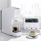 Zestaw wyróżnia się eleganckim, białym wyglądem oraz funkcjonalnością. Ciśnienie ekspresu 15 barów gwarantuje pełnię smaku, a trzy dostępne rozmiary filiżanek (mała, średnia, duża) pozwalają na idealne dopasowanie napoju do Twoich preferencji. Kluczową zaletą są 3 adaptery do kapsułek, które zapewniają pełną elastyczność wyboru. Adaptery można schować w dedykowanej szafce.