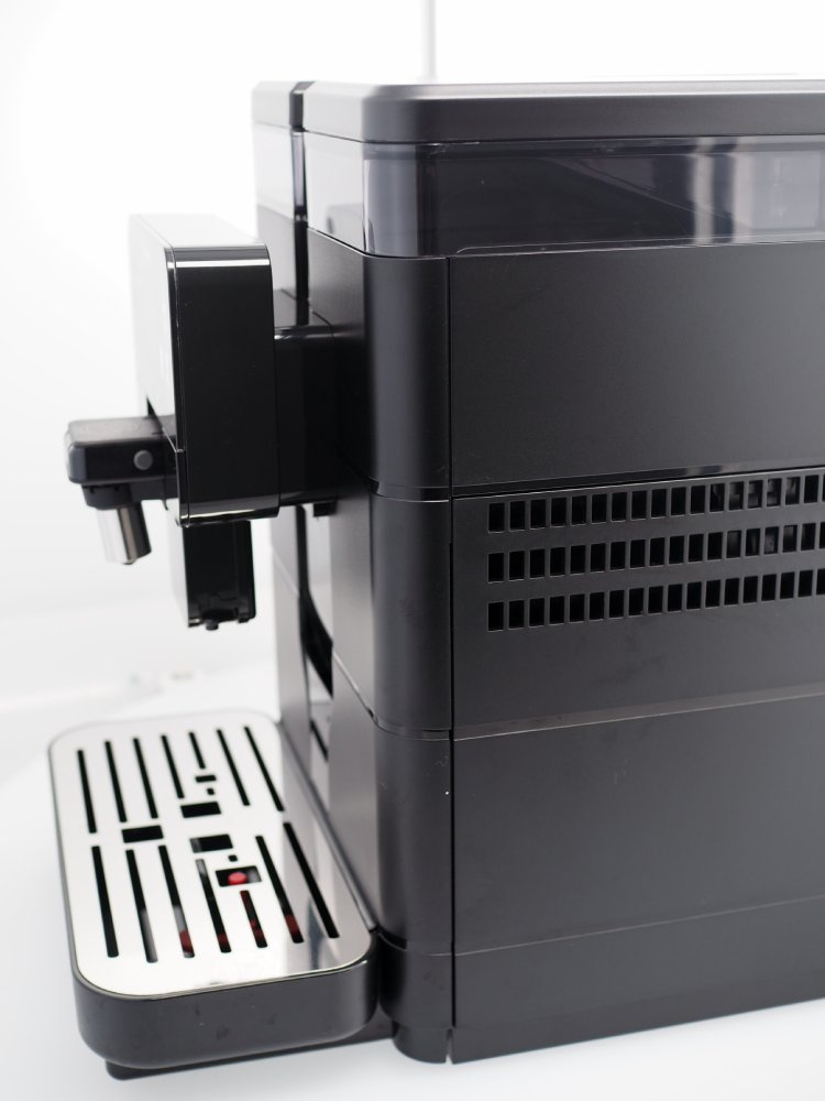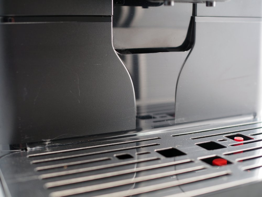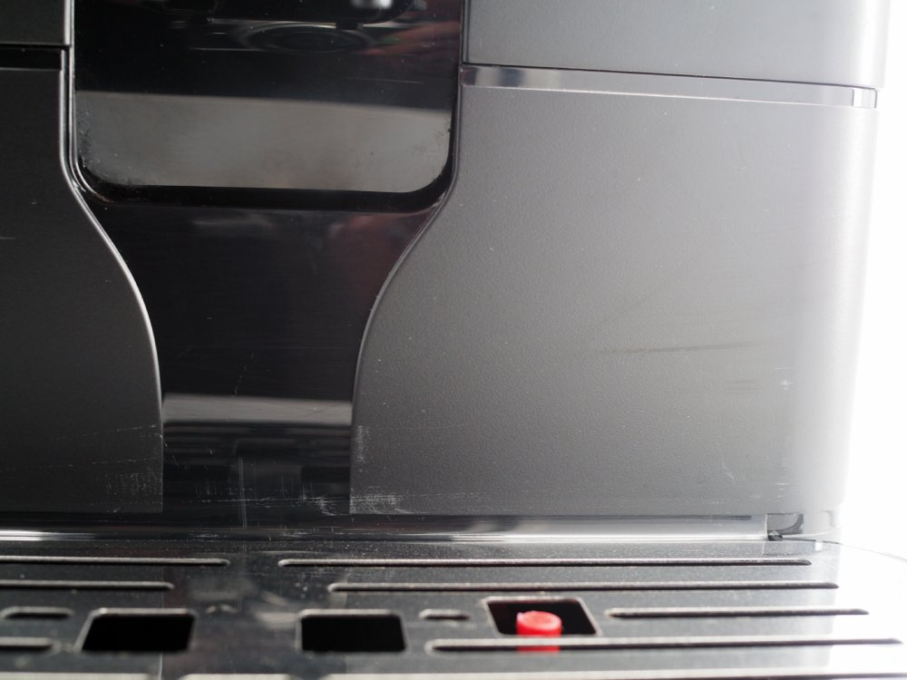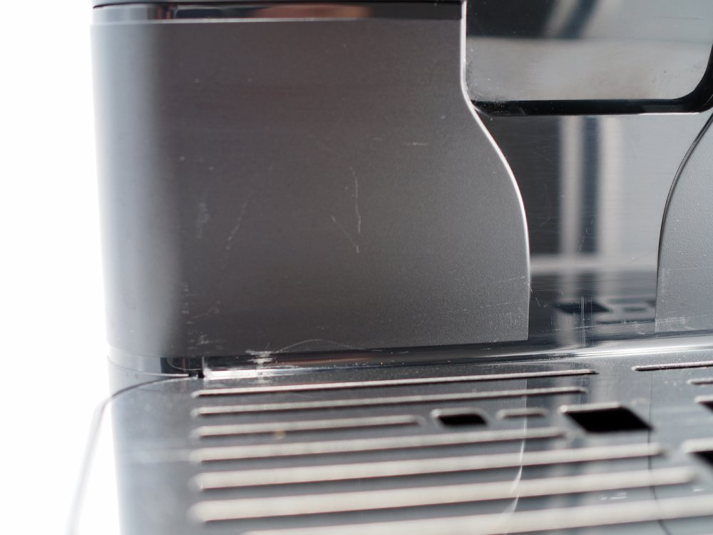 Młynek posiada delikatne rysy widoczne na zdjęciach na następujących elementach: taca ociekowa, przednia obudowa pod wylewką kawy, nad tacą ociekową, przestrzeń pomiędzy pokrywą zbiornika na wodę a pokrywą Hoppera. Rysa na tylnej ściance zbiornika na ziarna kawy. Plamy na bocznej i tylnej obudowie. Naklejka serwisowa na tylnej obudowie.