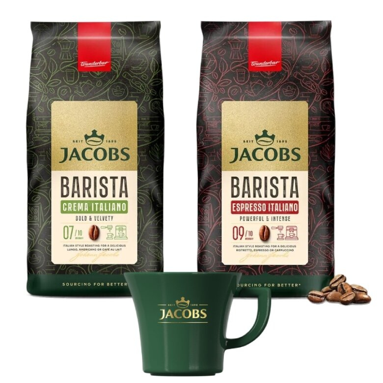 Zestaw dwóch kaw ziarnistych Jacobs, które sprawdzą się do przygotowania w ekspresach ciśnieniowych, french pressie lub kawiarce. Kawy z linii Jacobs Barista Edition posiadają certyfikat Rainforest Alliance i są wytwarzane z poszanowaniem zasad zrównoważonego rozwoju, co świadczy o zaangażowaniu marki w ochronę środowiska.