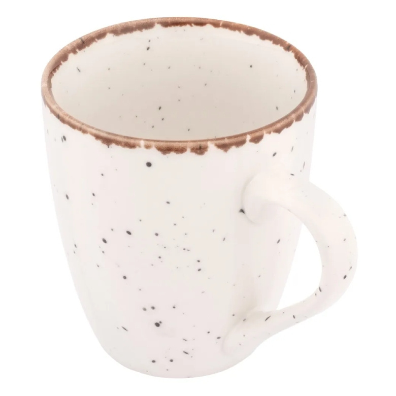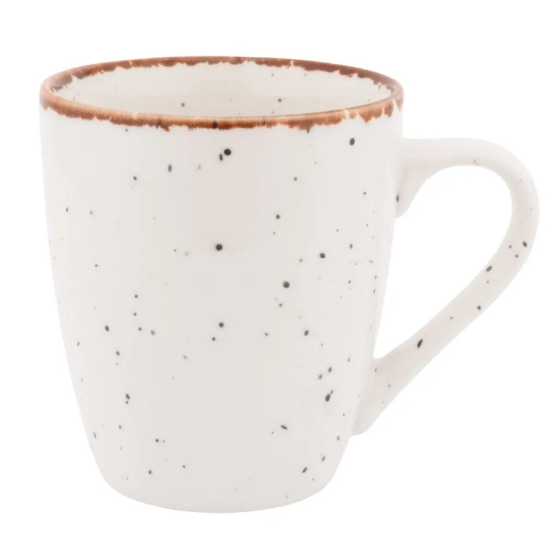 Kubek New Bone China ma kształt baryłki i wygodny, duzy uchwyt, który zapewnia komfort użytkowania. Wyróżniają go delikatne, nieregularne kropki oraz brązowa obramówka, nadająca mu wyjątkowego stylu. Minimalistyczny wygląd świetnie wpisze się zarówno w nowoczesne, jak i klasyczne wnętrza.