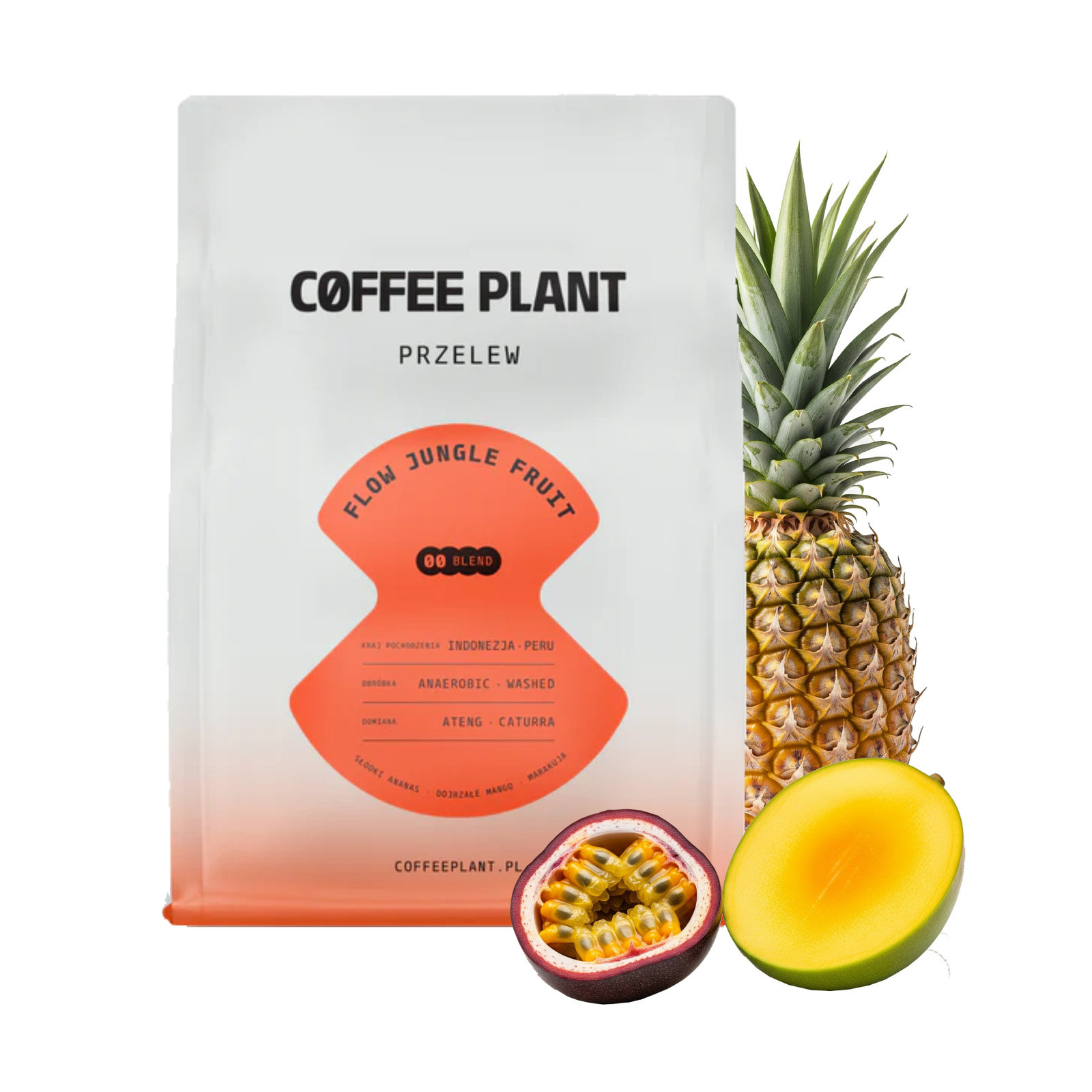 COFFEE PLANT Flow Jungle Fruit to kawa specialty, wypalona jasno pod metody przelewowe. Jest to blend ziaren arabiki pochodzących z Indonezji i Peru. Dwie różne obróbki (Anaerobic i Washed) doskonale się uzupełniają, tworząc bogaty smakowy pejzaż. W kawie dominują tropikalne akcenty: słodki ananas, dojrzałe mango oraz nuta marakui. To doskonała propozycja dla osób poszukujących ciekawych i intensywnych smaków w kawie przelewowej.