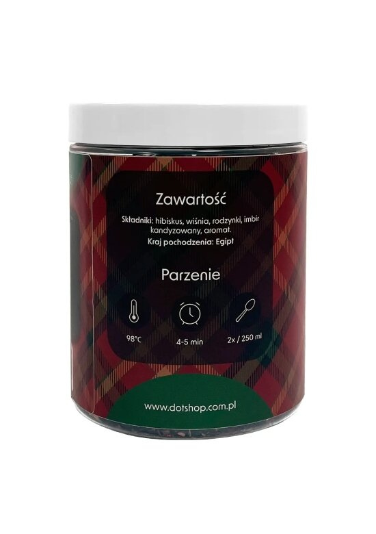 Składniki: hibiskus, wiśnia, rodzynki, imbir kandyzowany, aromat.