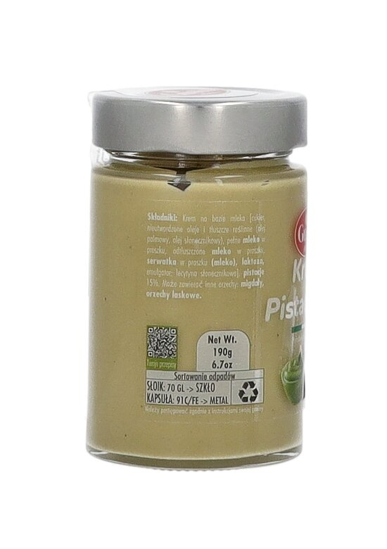 Skład: krem na bazie mleka (cukier, tłuszcze lub oleje roślinne (olej słonecznikowy, palmowy, ziarna palmowe), odtłuszczone mleko w proszku (10%), serwatka w proszku, emulgator (E322 lecytyna słonecznikowa), aromat (wanilina), pistacje 15%. Może zawierać inne orzechy: migdały, orzech laskowy.