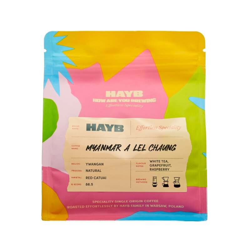 HAYB Myanmar A Lel Chaung to kawa specialty z Azji, a dokładnie z Myanmaru (Birma), która została specjalnie wypalona do przelewowych metod parzenia. Składają się na nią jasno palone ziarna arabiki Specialty Single Origin, odmiany Red Catuai, które rosną na wysokości 1300 m n.p.m. w regionie Ywangan. Kawa została poddana obróbce naturalnej, a w teście jakości uzyskała 86,48 punktów.