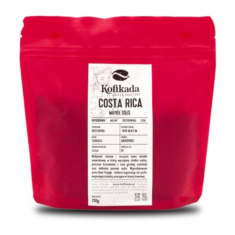 Kawa ziarnista Kostaryka Mayra Solis to kawa segmentu speciality z Kostaryki, która zachwyci miłośników wyrafinowanych smaków. Dzięki starannie wyselekcjonowanym ziarnom pochodzącym z farmy Mayry Solis w Kostaryce, gdzie rosną na wysokości 2100 m n.p.m, kawa ta jest doskonałym wyborem do parzenia metodami alternatywnymi. Proces obróbki anaerobowej nadaje tej kawie niepowtarzalny charakter, łącząc tradycję z nowoczesnością. W teście jakości SCA uzyskała 87 punktów.