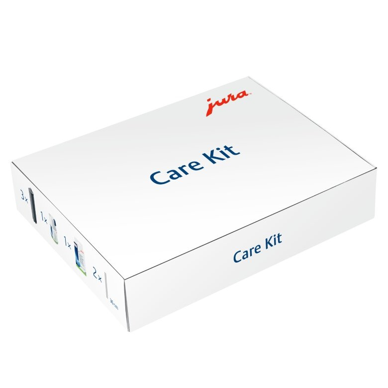 Zestaw, który zawiera wszystkie niezbęne produkty do pielęgnacji. Jura Care Kit zawiera 3 wkłady filtrujące Claris Smart Plus, mini tabletki do czyszczenia systemu mleka, 6 tabletek czyszczących i 2 rurki na mleko.