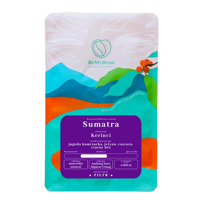 BeMyBean Sumatra Kerinci to jasno palona arabika jakości specialty z Sumatry przeznaczona do przelewowych metod parzenia. Jej ziarna odmian Andung Sari i Sigarar Utang rosną na wysokości 1600 m n.p.m. w regionie Aceh Province i zostały poddane obróbce metodą anaerobic natural.