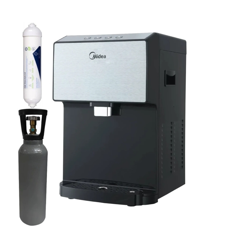 Midea JS1844T SODA PLUS SILVER to nablatowy dystrybutor wody gazowanej. Jest idealny do biur, poczekalni oraz innych przestrzeni publicznych, zapewniając wygodny dostęp do trzech rodzajów wody - gorącej, zimnej i gazowanej. Dystrybutor nie posiada butli, dzięki czemu, urządzenie eliminuje konieczność przechowywania i wymiany butli, co oszczędza miejsce i czas. Wymaga połączenia do sieci wodociągowej.