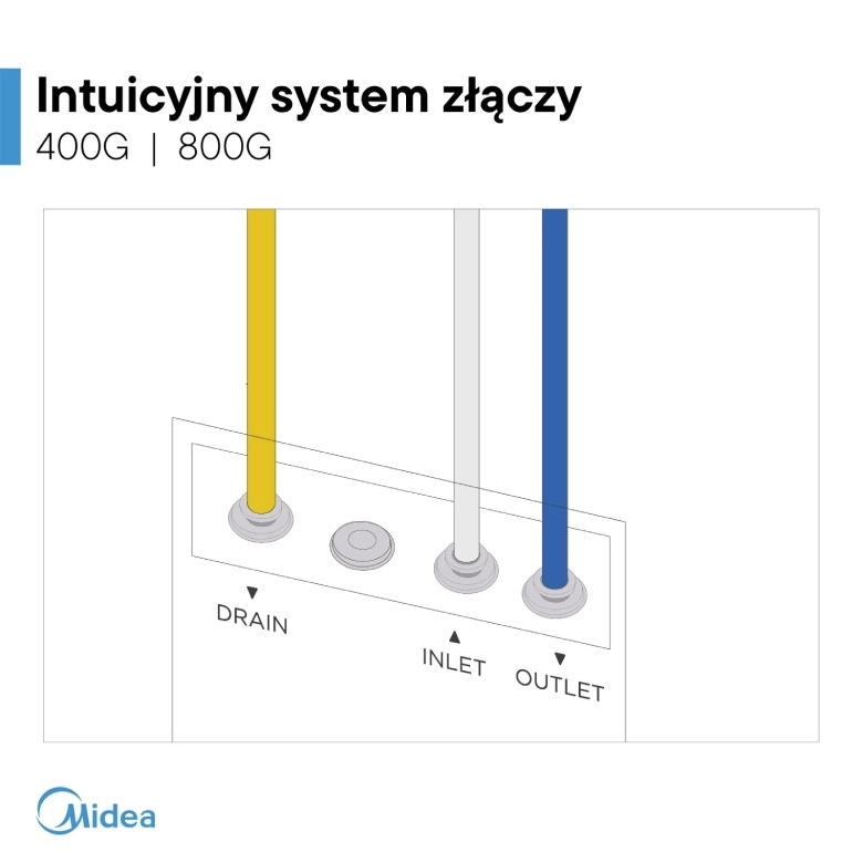 - Kompaktowe wymiary –Filtr jest bardzo łatwy w montażu, pod zlewem. łatwy montaż pod zlewem. Filtr Midea zajmuje minimalną ilość miejsca, co czyni go idealnym rozwiązaniem nawet dla niewielkich kuchni.