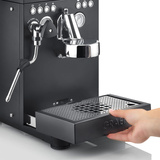 Graef Batessa posiada wyciągany zbiornik na wodę o pojemności 2,5 litra, a powiadomienie o niskim poziomie wody zapobiega niespodziewanym przerwom w parzeniu i uszkodzeniom urządzenia. Stalowa tacka ociekowa jest łatwa w czyszczeniu, a dzięki pasywnie podgrzewanej półce filiżanki są zawsze ciepłe.