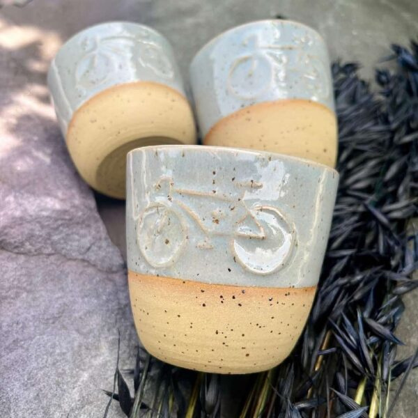 Ceramiczny kubek z wypukłym logiem roweru od POTPOTSTUDIO, który doskonale sprawdzi się do przygotowania aromatycznej kawy lub gorącej herbaty. Do wykonania kubka wykorzystuje się jasną glinę nakrapianą oraz szkliwo efektywne. Kubek wypalono w temperaturze 1240 stopni i pokryto szkliwem, które jest dopuszczone do kontaktu z żywnością.