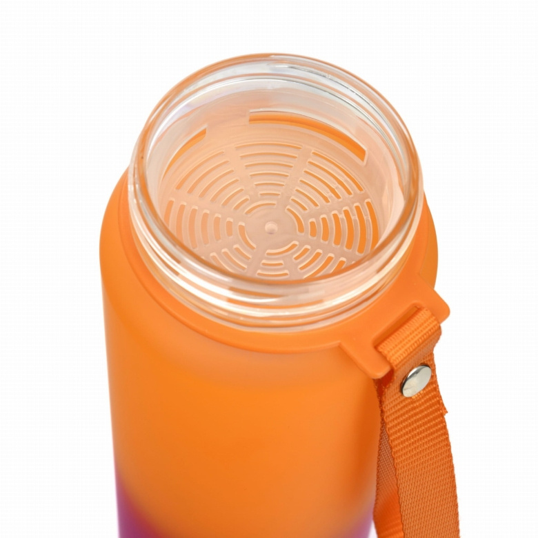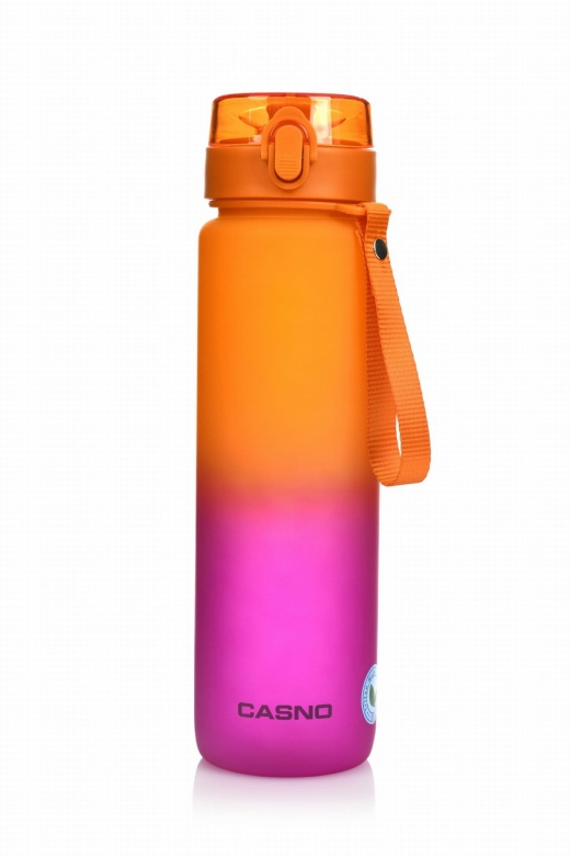 Pomarańczowo-różowa butelka na wodę Casno Missouri ma pojemność 1050 ml i z łatwością zmieści się w każdej torbie lub plecaku. Przymocowana opaska sprawia, że możemy przymocować butelkę do nadgarstka. Butelka posiada filtr, który sprawdzi się do przechowywania wody z owocami i miętą.