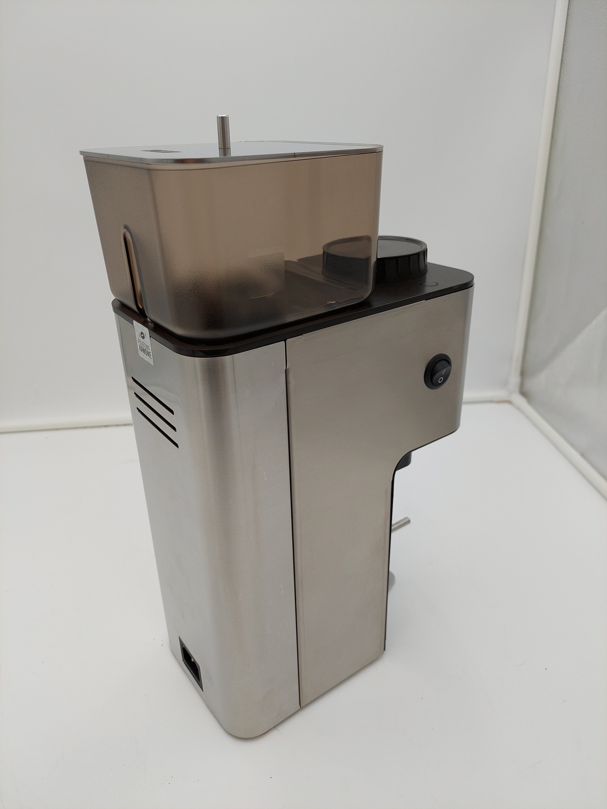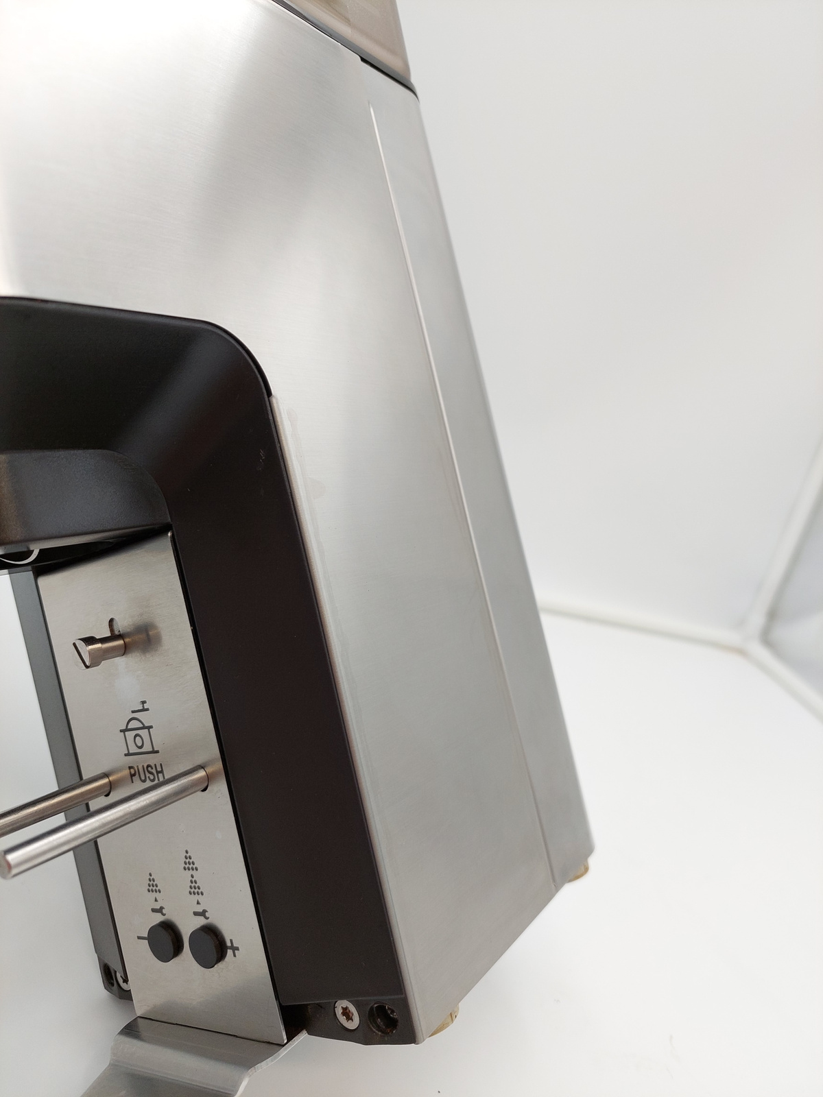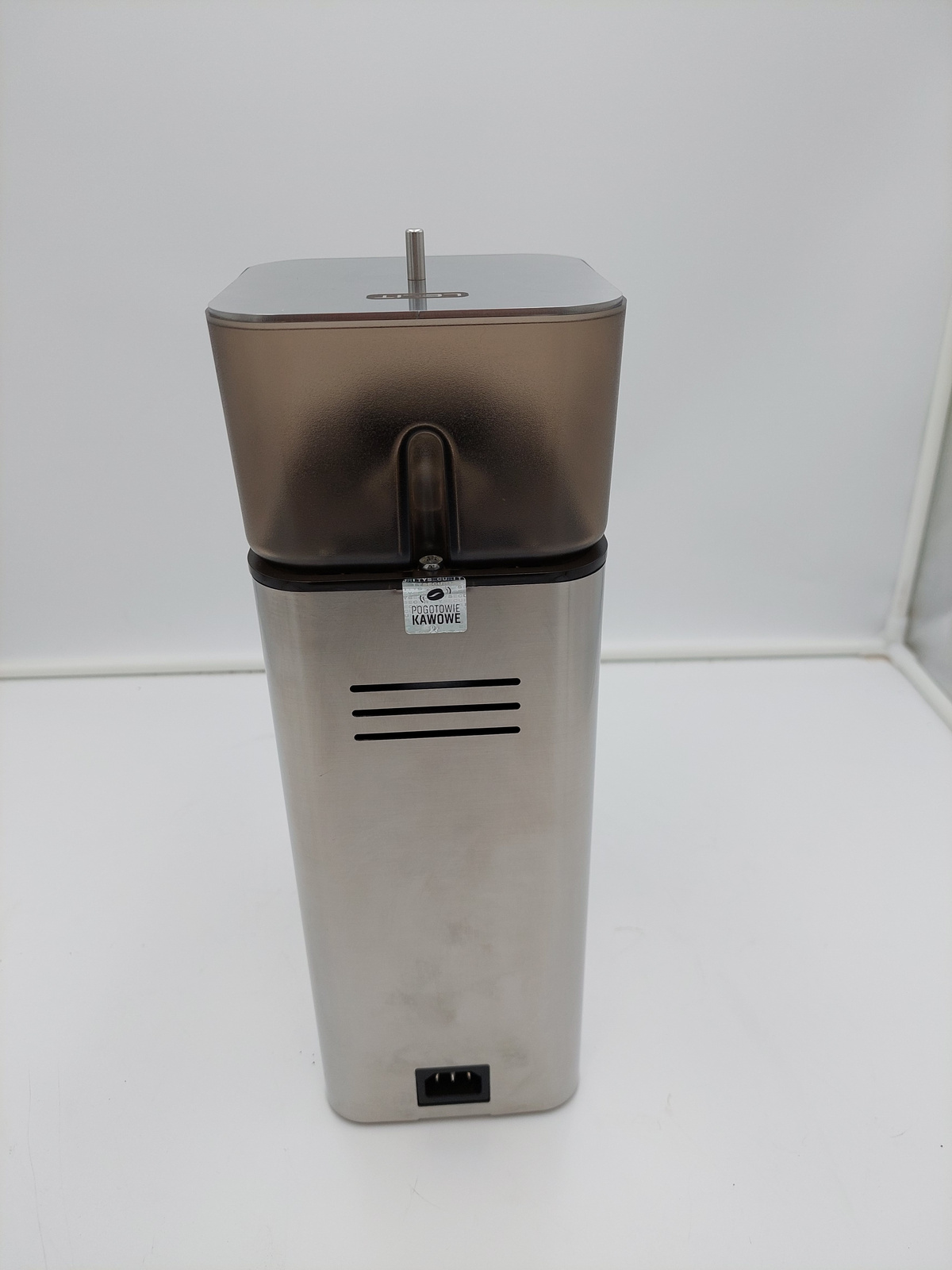 Młynek posiada delikatne rysy i plamki/zacieki widoczne na zdjęciach na następujących elementach: przednia, lewa, prawa i tylna obudowa, hopper, pokrywa hoppera, pokrętło, obudowa przy uchwycie na portafilter, podstawka.