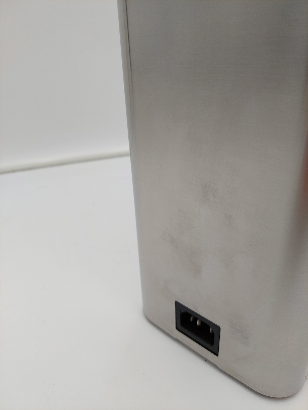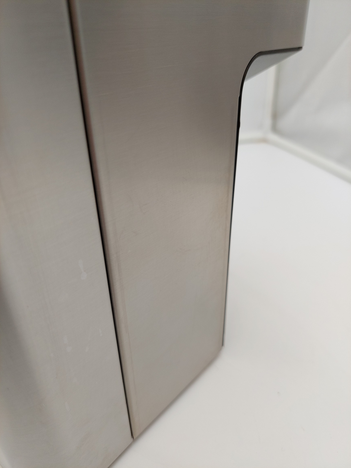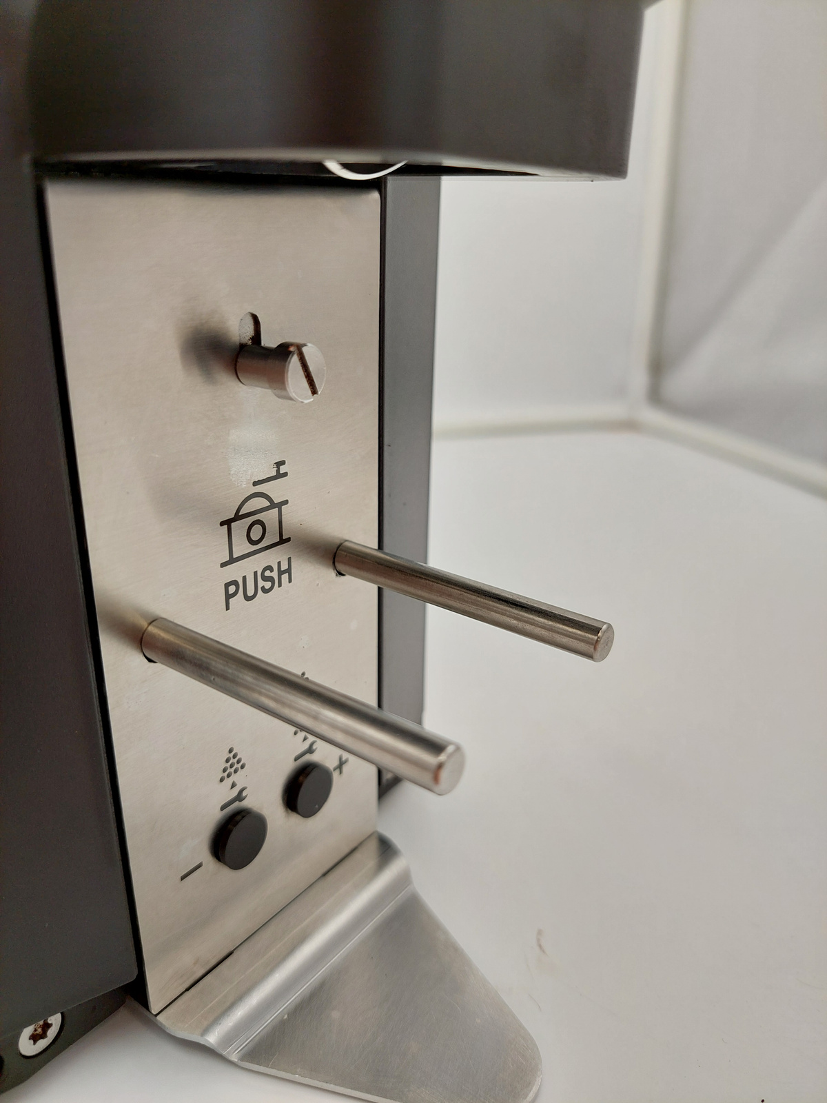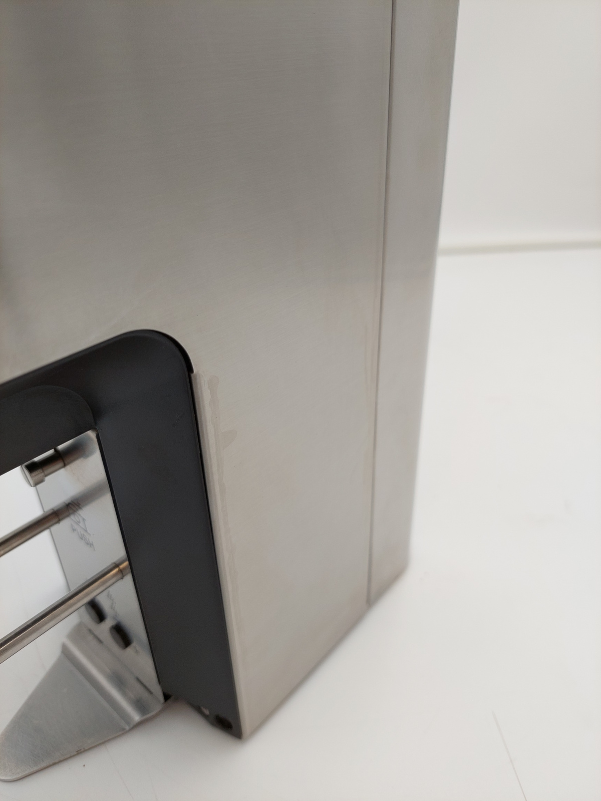 Młynek posiada delikatne rysy i plamki/zacieki widoczne na zdjęciach na następujących elementach: przednia, lewa, prawa i tylna obudowa, hopper, pokrywa hoppera, pokrętło, obudowa przy uchwycie na portafilter, podstawka.