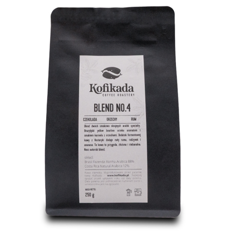 Kofikada Blend Nr 4 to średnio palona mieszanka dwóch arabik specialty – z Brazylii i Kostaryki. Stworzona z myślą o miłośnikach espresso o nowoczesnym profilu smakowym. Doskonale sprawdzi się w ekspresie ciśnieniowym oraz kawiarce. Brazylijska arabika została poddana obróbce naturalnej, natomiast kostarykańska – fermentowanej metodzie natural reposado.